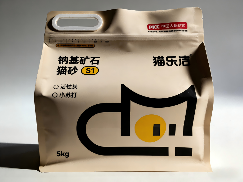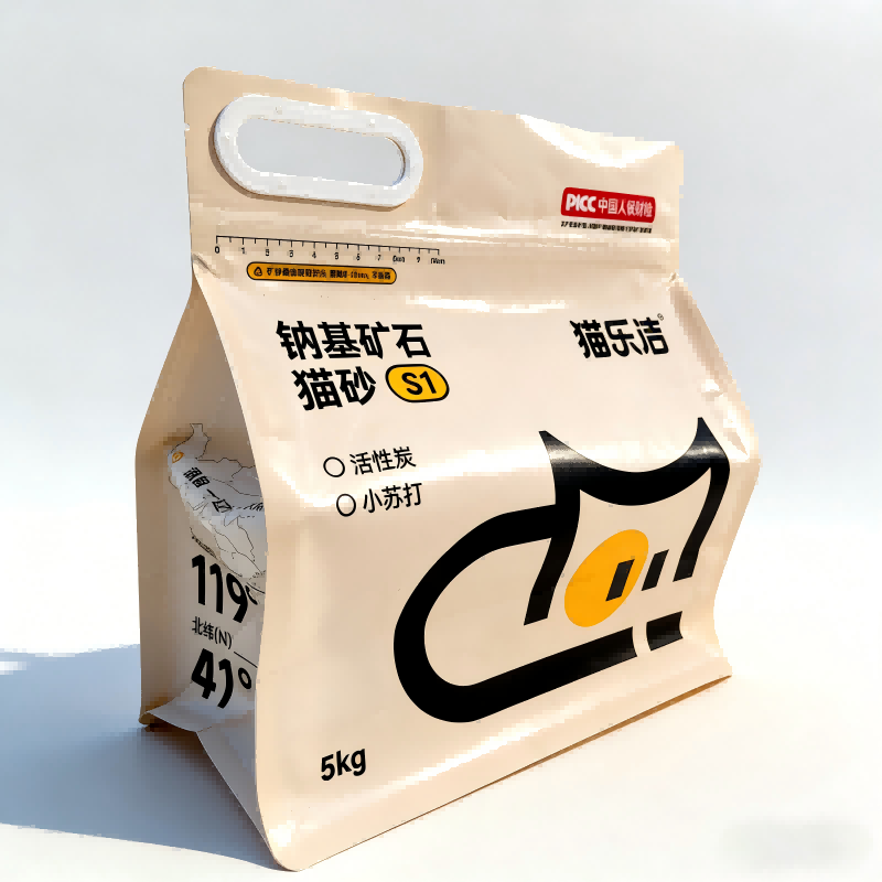 Структура на чантата: Осемстранната уплътнителна структура осигурява изправена, стабилна форма, идеална за излагане на рафтове. Затварящият се цип и подсилената пластмасова ръкохватка позволяват лесно боравене и сигурно съхранение на 5 кг котешка тоалетна.