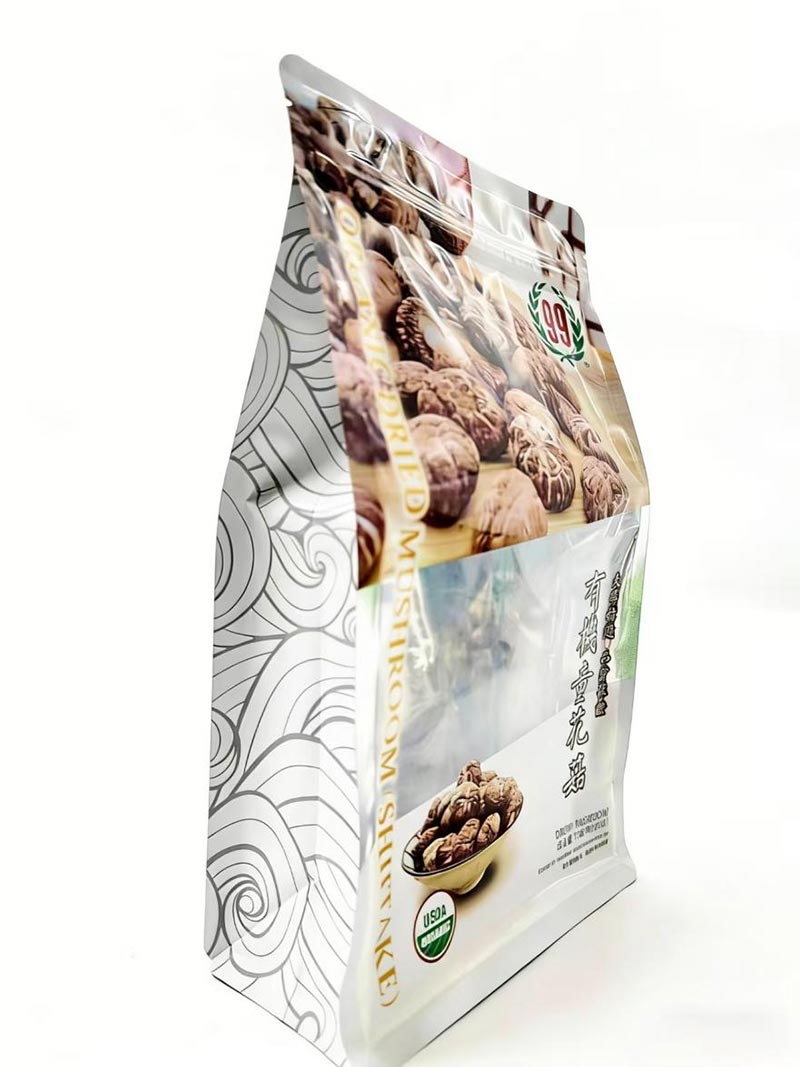 Изборът на опаковка пряко влияе върху съхранението и представянето на сушените плодове. Основните типове опаковки, предлагани на пазара, включват тристранно запечатване, четиристранно запечатване, стоящи торбички и осемстранно запечатани торби. Сред тях, торбичката с осем страни е предпочитаният избор. В сравнение с други типове чанти, осемстранната запечатана торба има осем запечатани ръба, което й позволява да стои изправена с плоско дъно, което я прави идеална за излагане на рафтовете на магазините. Този тип чанта осигурява пет страни за брандиране и може да бъде персонализирана с различни графики, което я прави подходяща както за търговия на дребно, така и за електронна търговия.
